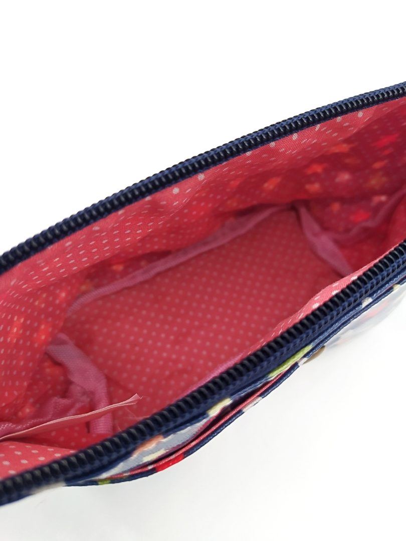 - Forro de dentro de tela rosa con lunares blancos.